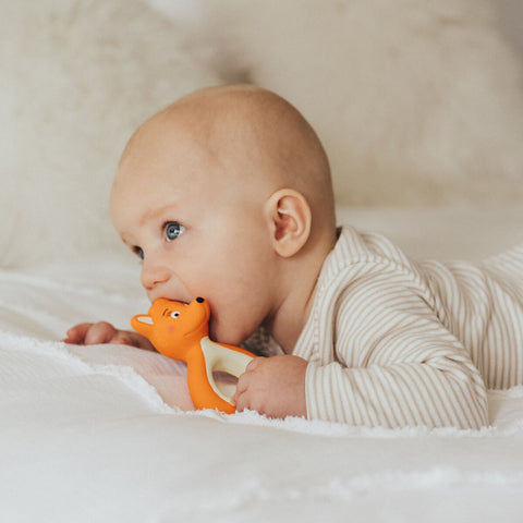 Learn moreMizzie The Kangaroo Mini Mizzie Baby Teether is made from 100% natural rubber and is safe for your little one to chew on, soothing sore gums naturally.