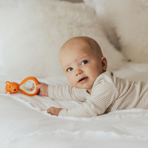 A mini 'on-the-go' version of Australia's original natural teething toy, Mizzie The Kangaroo, Mini Mizzie is sure to ease bub's sore gums with her soft rubbery texture. Perfect for sensory development, Mini Mizzie helps develop the senses of sight, touch, and smell. This little teether has no hole and doesn’t squeak, making it perfect for travelling, the pram, the car, or as your go-to at home.