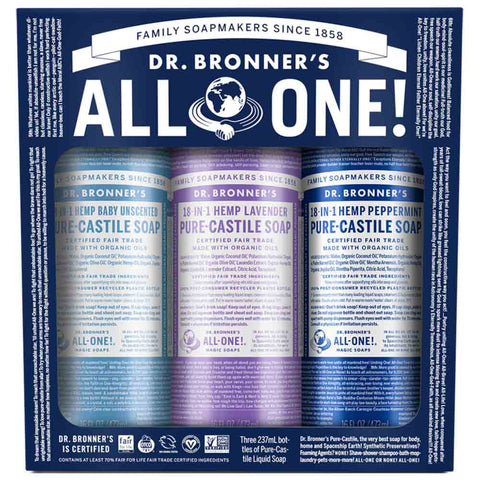 Your all-time favourite scents are ready for gift giving. The Cosmic Classics multi-pack includes 3 x 237ml bottles of Dr Bronner's Liquid Soap. One each of Lavender, Baby Unscented and Peppermint.