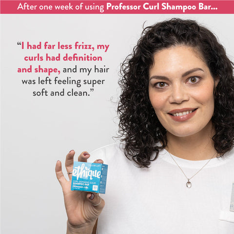 Ethique Professor Curl Curl-Defining Solid Shampoo Bar is a vegan shampoo bar for curly hair, perfect for cleansing without leaving hair dry or frizzy.