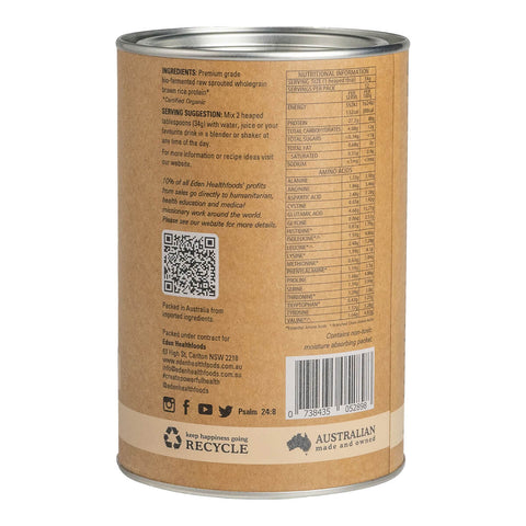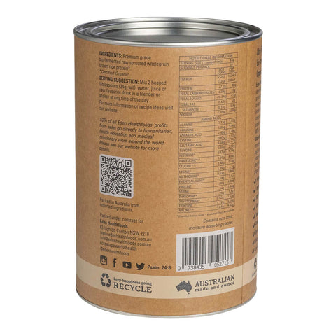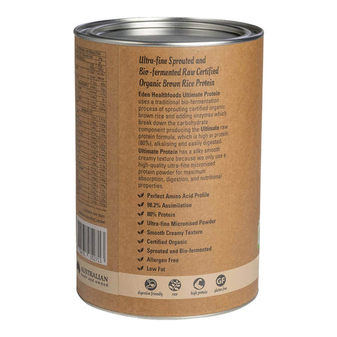 Learn moreEden Healthfoods Ultimate Protein - Natural uses a traditional bio-fermentation process involving the sprouting of certified organic brown rice protein and the addition of enzymes to break down the carbohydrate component. This process produces an ultimate raw protein supplement that is high in protein (80%), alkalising, and easy to digest.
