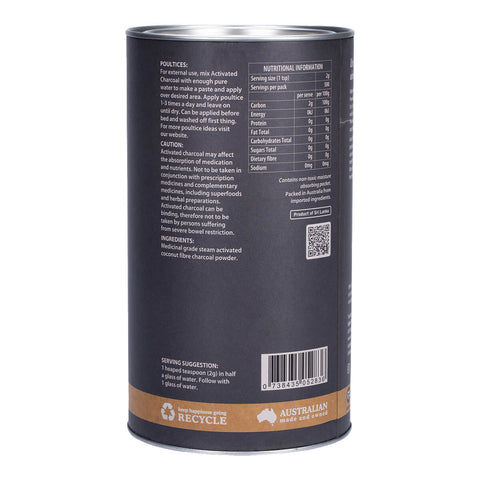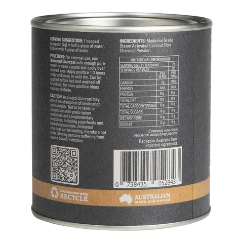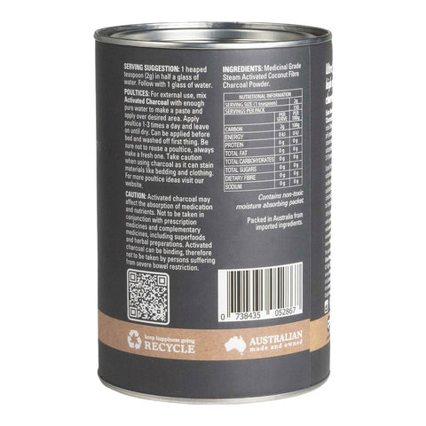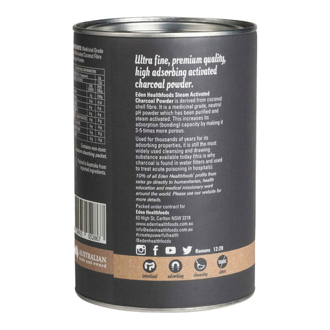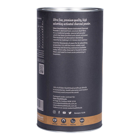 Learn moreEden Healthfoods Activated Charcoal Powder is an ultra-fine powder derived from pure coconut shell fibre. It has been steam activated (unlike chemical activation), making it 3-5 times more porous. It has also been medicinally activated using a purification process which empties the carbon molecules completely, further increasing its surface area, which enhances its adsorption and drawing capacity (more than steam activation alone).