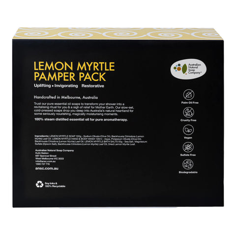 Learn moreAustralian Natural Soap Company Lemon Myrtle Pamper Pack is bursting with citrus-fuelled zest and zing. Wake up and get ready to wow your world. Wind down at day's end then power up for the evening's adventures. Invigorate and energise anytime.