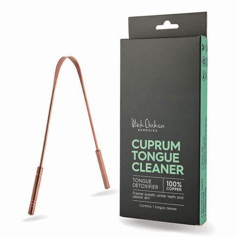 Black Chicken Remedies Cuprum Tongue Cleaner is 100% pure copper, effective for removing oral bacteria from the tongue for fresher breath, whiter teeth and clearer skin.