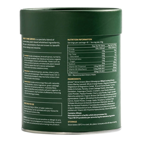Learn moreeimele Shine Greens - Home Edition is a daily greens formula crafted with ingredients that enhance your body's natural detoxification process, bolster immunity and gut health, support the gut microbiome, and optimise the function of essential detoxification organs.