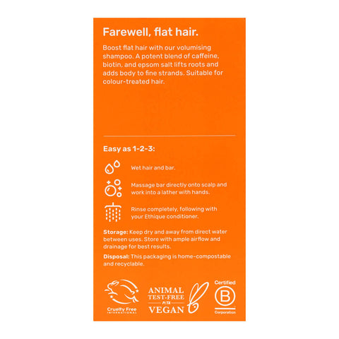 Learn moreEthique Volumising Solid Shampoo for Fine, Flat Hair is like an espresso shot for your strands. A blend of caffeine, biotin, and epsom salt provides added lift at the roots and helps to add body to fine hair. Get ready for a fuller, more voluminous mane that defies gravity.