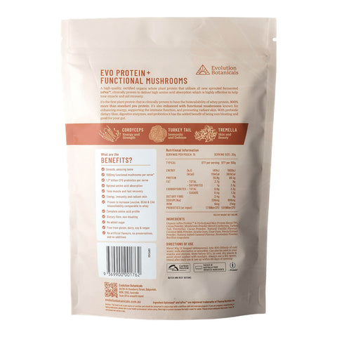 Learn moreEvolution Botanicals EVO Protein + Functional Mushrooms - Smooth Chocolate builds muscle tone and sustains energy. This certified organic blend delivers ultra-bioavailable Optimised plant protein, clinically proven to match whey, plus 1500mg of power-packed functional mushrooms. Enhanced with gut-friendly enzymes and probiotics, it's super smooth, delicious, and powered for performance, recovery, and vitality.