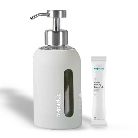 Learn moreResparkle Foaming Hand Wash Starter Kit contains a 400ml reusable glass bottle (empty), an attachable foaming hand pump and 2x plastic-free concentrate refill sachets. Resparkle has made it super easy to cut down on single-use plastic with this refillable stylish bottle and powder refills. Simply pour the refill into the bottle and add water!