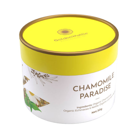 Golden Wattle Chamomile Paradise Tea features chamomile, nettle leaves, echinacea, and apple chips, offering a powerful combination of health benefits.