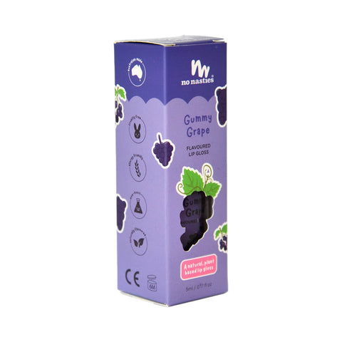 Learn moreNo Nasties Kids Natural Lip Gloss - Gummy Grape is reminiscent of chewy gummy bears. This nourishing, lightly purple-shimmered gloss glides on smoothly, delivering a soft, balmy finish to keep lips hydrated and happy - without a hint of plastic glitter.