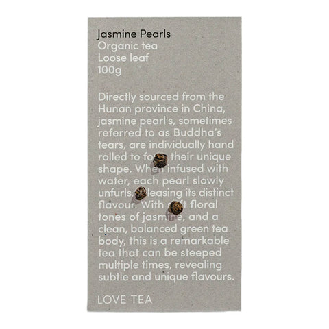 Learn moreLove Tea Jasmine Pearls Loose Leaf Tea is directly sourced from the Hunan province in China. Jasmine pearls, sometimes referred to as Buddha’s tears, are individually hand-rolled to form their unique shape. When infused in water, each pearl slowly unfurls, releasing its distinct flavour. With soft floral tones of jasmine and a clean, balanced green tea body, this remarkable tea can be steeped multiple times, revealing subtle and unique flavours.