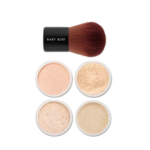 Learn moreLily Lolo Mineral Starter Collection in Light: a Baby Kabuki Brush with 3 Samples of Foundation and 1 Sample of Finishing Powder, available at Flora & Fauna.