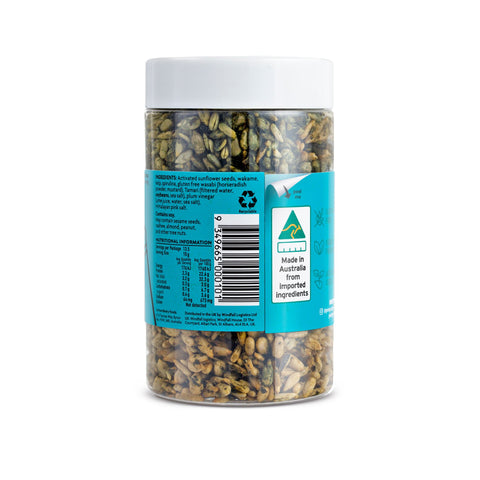 Activated Sunflower Seeds, Wakame, Kelp, Spirulina, Gluten-free Wasabi (Horseradish Powder, Mustard), Tamari (Filtered Water, Soybeans, Sea Salt), Plum Vinegar (Ume Juice, Water, Sea Salt), Himalayan Pink Salt.