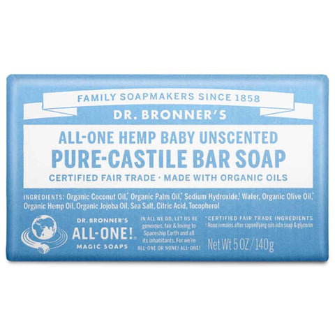 With no added fragrance and double the olive oil, Dr Bronner's Baby Unscented Pure-Castile Bar Soap is good for sensitive skin and babies. Dr Bronner's Bar Soap is made with certified fair-trade ingredients and organic hemp oil for a soft, smooth lather that won't dry your skin. 100% biodegradable in a 100% post-consumer recycled wrapper.