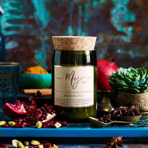 Learn moreMojo Candle Co. Reclaimed Wine Bottle Soy Wax Candle - Moroccan Spice lets your senses run wild as they’re transported to the exotic souks of Morocco. A rich and fragrant blend of alluring spices, sticky honey, and bergamot combine to create this sweetly spiced, adventurous scent. Woody base notes of agarwood and sandalwood add an earthy depth to the fragrance.