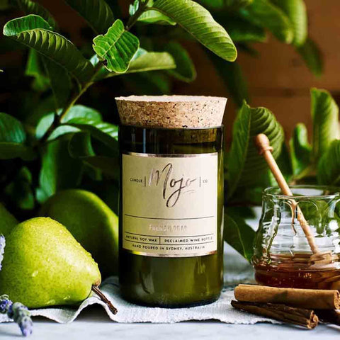 Mojo Candle Co. Reclaimed Wine Bottle Soy Wax Candle - French Pear is light, feminine, and deliciously French. This candle derives its classic fragrance from the celebrated pear variety Doyenné du Comice. Translated as “top of the show,” these pears are the best of the best, yielding a scent that is rich, juicy, and meltingly smooth.