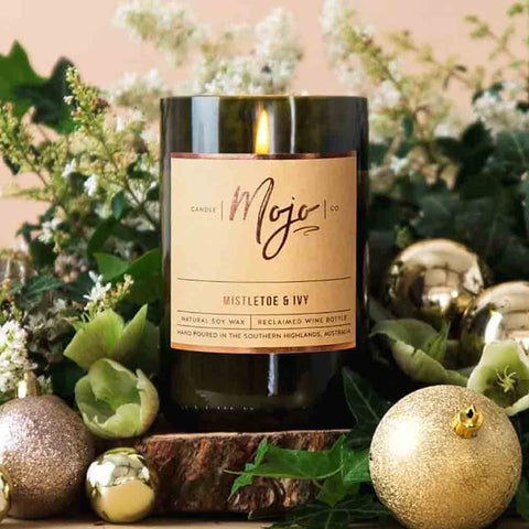 Mojo Candle Co. Reclaimed Wine Bottle Soy Wax Candle - Mistletoe & Ivy celebrates the glowing feeling of being kissed under the mistletoe. This Christmas edition blends the stunning notes of Siberian fir, mistletoe, and cedar leaf, wrapped in climbing ivy, vetiver, frosted musk, and sensuous sandalwood.