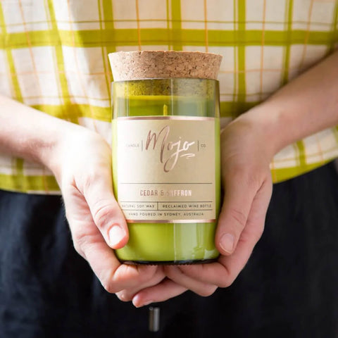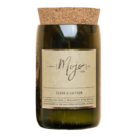 Learn moreMojo Candle Co. Reclaimed Wine Bottle Soy Wax Candle - Cedar & Saffron is a seductive fragrance that is all about luxury. Immediate notes of bergamot are paired with robust aniseed and cinnamon, veiled with a base of vanilla, musk, and patchouli to create a scent that is lush and lavish. This candle is the perfect accompaniment to a hot bubble bath and a glass of champagne.