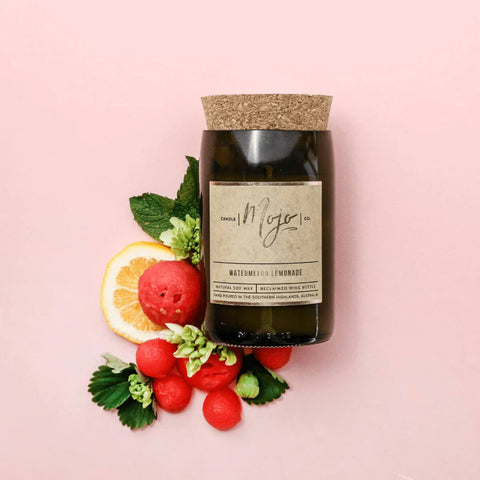 Learn moreMojo Candle Co. Reclaimed Wine Bottle Soy Wax Candle - Watermelon Lemonade is fun, quirky, and vibrant with a youthful scent that captures the essence of summer. The deliciously refreshing combination of watermelon, lemon, and casaba melon creates a fragrance that will transport you straight to a pool party.