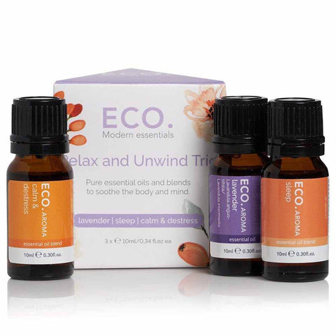 Learn moreECO. Modern Essentials Relax & Unwind Essential Oil Trio features three of their best-selling essential oils and blends to help soothe the mind and body. Sit back, relax and unwind. Rotate the use of individual oils or be creative and blend them together.