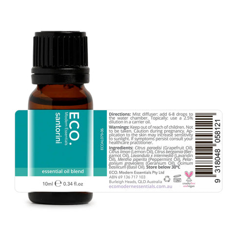 ECO. Modern Essentials Santorini Essential Oil Blend combines notes of pink grapefruit, lemon, bergamot, geranium and peppermint. This fresh and subtle scent transports you to a Greek island where you can relax and escape from daily stresses. If you can't get to Santorini, this gorgeous essential oil blend is the next best thing.