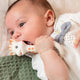 The Ring Teether features a textured ring with a ridged surface for developing teeth and round dots to help sooth painful gums.