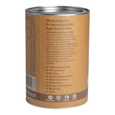 Learn moreEden Healthfoods Ultimate Protein - Chocolate uses a traditional bio-fermentation process involving the sprouting of certified organic brown rice protein and the addition of enzymes to break down the carbohydrate component. This process produces an ultimate raw protein supplement that is high in protein (80%), alkalising, and easy to digest.